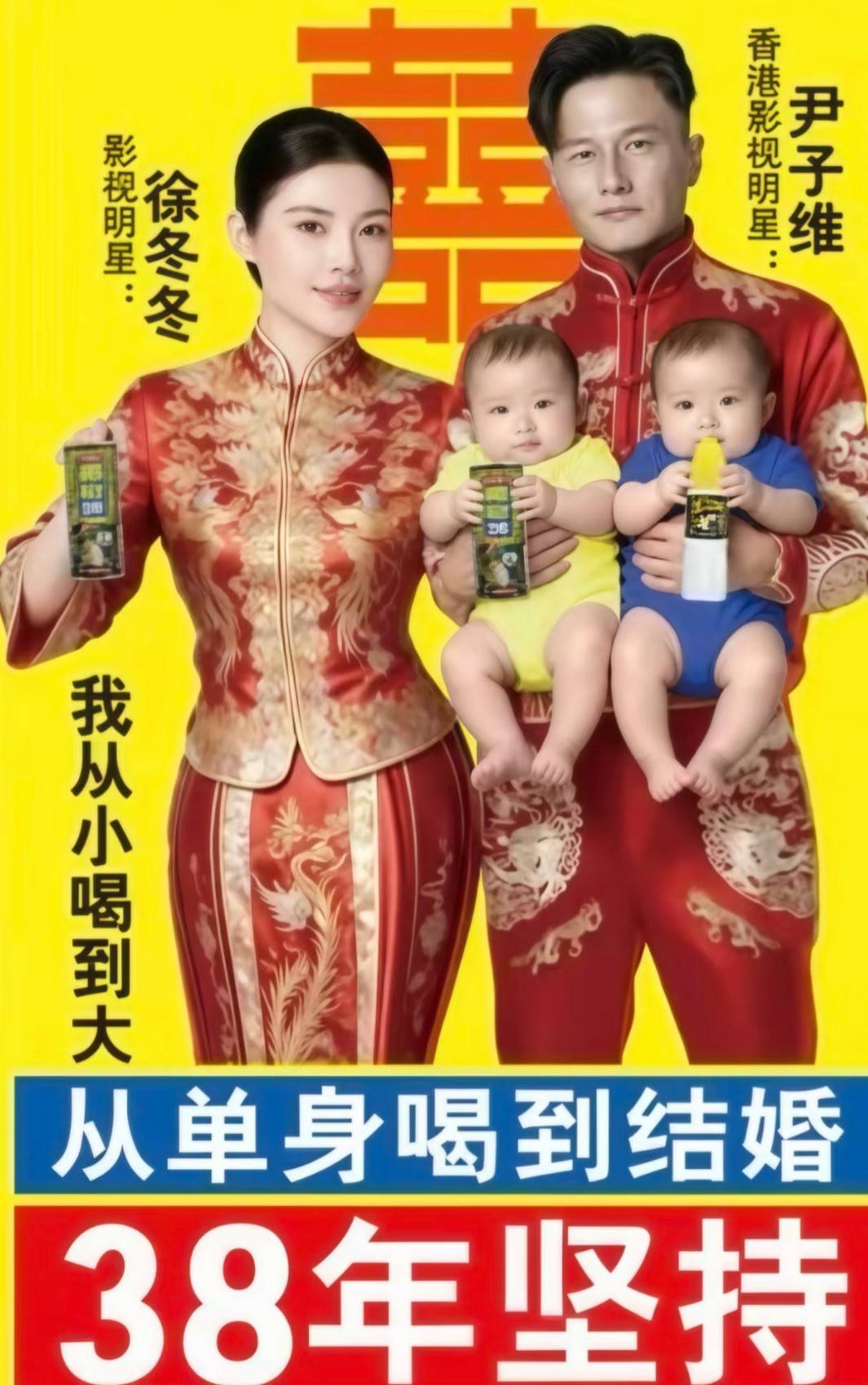 椰树集团为祝贺徐冬冬结婚而特别定制椰汁海报,图中,两人身着红色中式礼服,怀抱两个婴儿,背景是标志性的椰树黄与红,文案更是直白:“从单身喝到结婚”“新婚幸福,早生龙凤”。这种“土到极致便是潮”的风格,与徐冬冬一贯的“接地气”形象不谋而合。