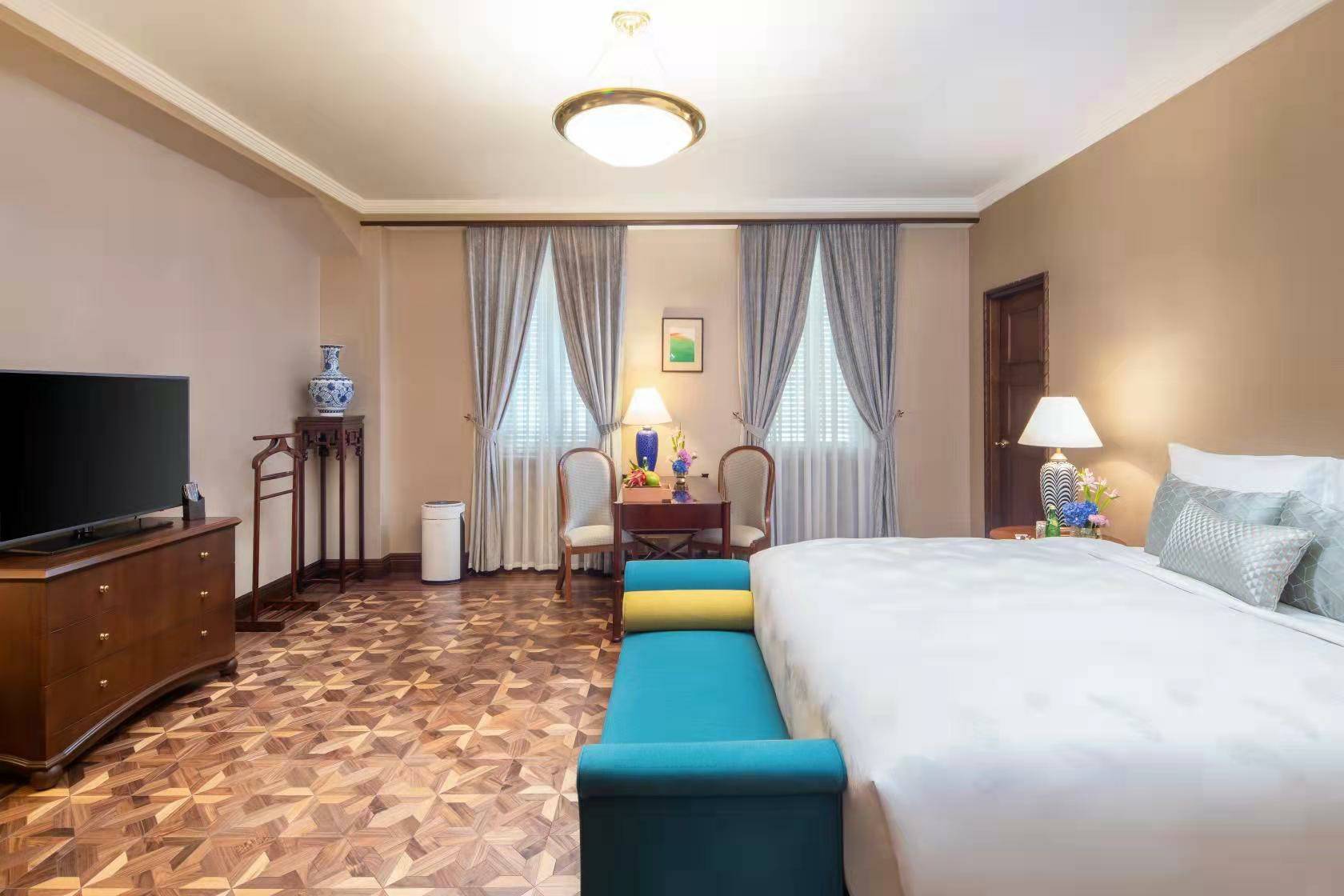 2020年酒店对贵宾楼中条200平方米的锦江套房进行了全新的改造升级,锦江套房主要是两房的房型,配有独立的会客厅及书房,适合商务出差人士办公休息。装修时酒店对木地板进行了修缮,保留了原来木地板的颜色及形状,更换了墙纸,使用了复古优雅的米色,房间里配有豪华的布艺、家具和设施,以浓重而不失活泼的色调、大气简洁的布局、自然优美的线条,为入住客人带来豪华舒适的体验。