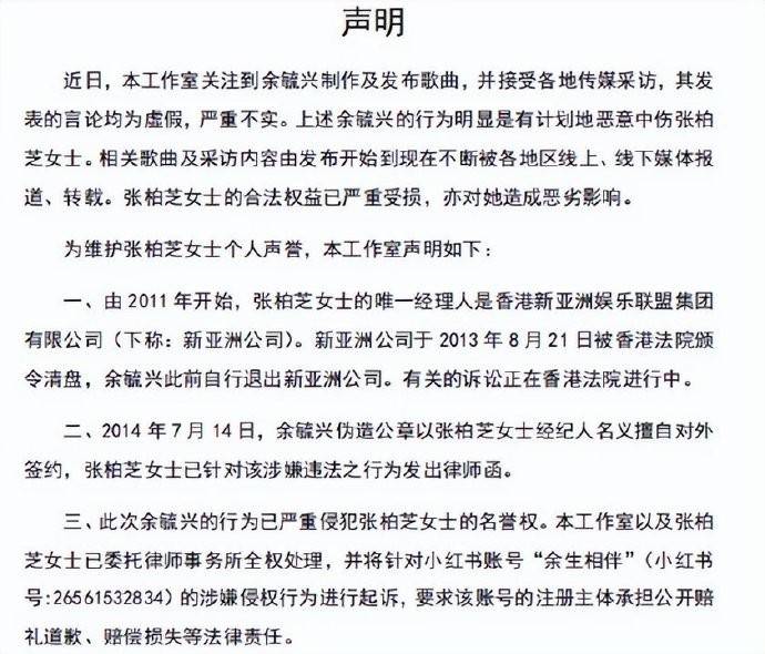 2014年,余毓兴涉嫌伪造公章以张柏芝名义签约《女神的新衣》遭起诉;